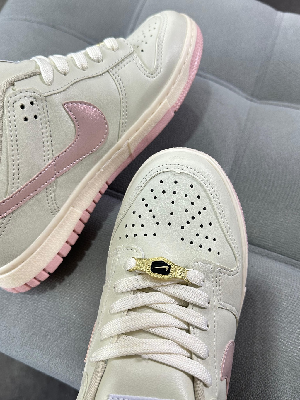 O cabedal em couro premium nas cores Sail (off-white/creme) e o toque sutil de Pink Foam (rosa suave) no Swoosh e no solado criam um visual que é ao mesmo tempo marcante e fácil de combinar. Seu design clássico e a estrutura de conforto comprovada do Dunk garantem que você esteja estilosa e confortável o dia todo, seja com jeans, vestidos ou peças de alfaiataria.